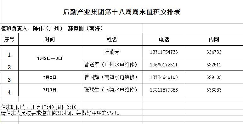 后勤产业集团第十八周周末值班安排表